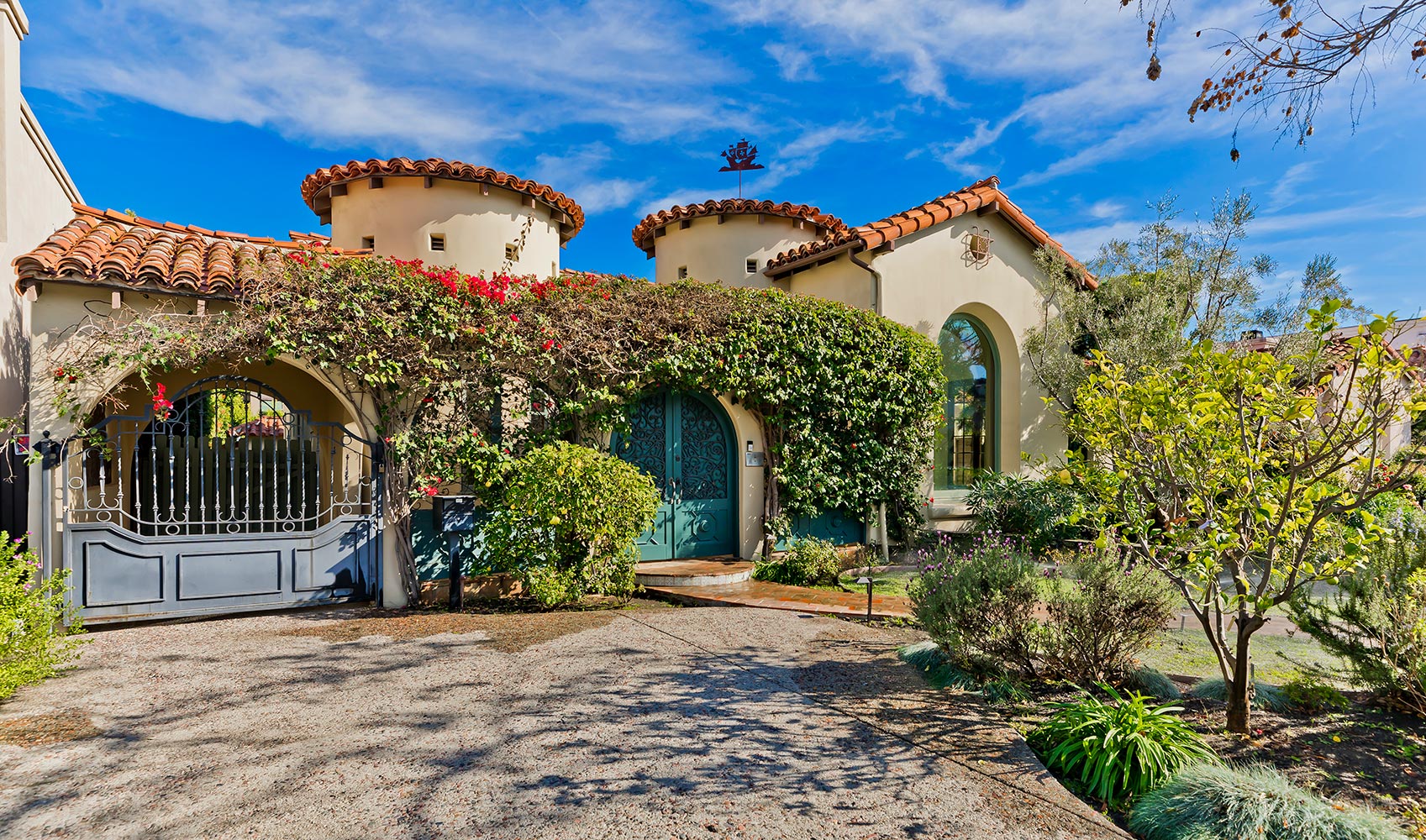 Welcome to this wholly charming and redone 1 story 3 bedroom Spanish home in the middle of the 300 block on one of Beverly Hills' most coveted quiet roads south of Wilshire. Enter via a gated courtyard which provides unique seclusion and privacy. Sunlit rooms abound featuring dark wood floors and French doors. Dramatic super-high ceiling living and dining rooms. Phenomenal large and custom cook's kitchen with top appliances and generous curved breakfast area. Master suite with gorgeous bath and walk-in closet along with a secondary large bedroom open to a beautifully designed private yard with covered patio, fireplace, oversized spa with water feature, and a fantastic guest unit/recreation room (over 330 sq. ft. per R.E.S.T.) with a lovely bath. With curb appeal enhanced by a stunning galleon-like weather vane, this is the house which you will be proud to call your "home".